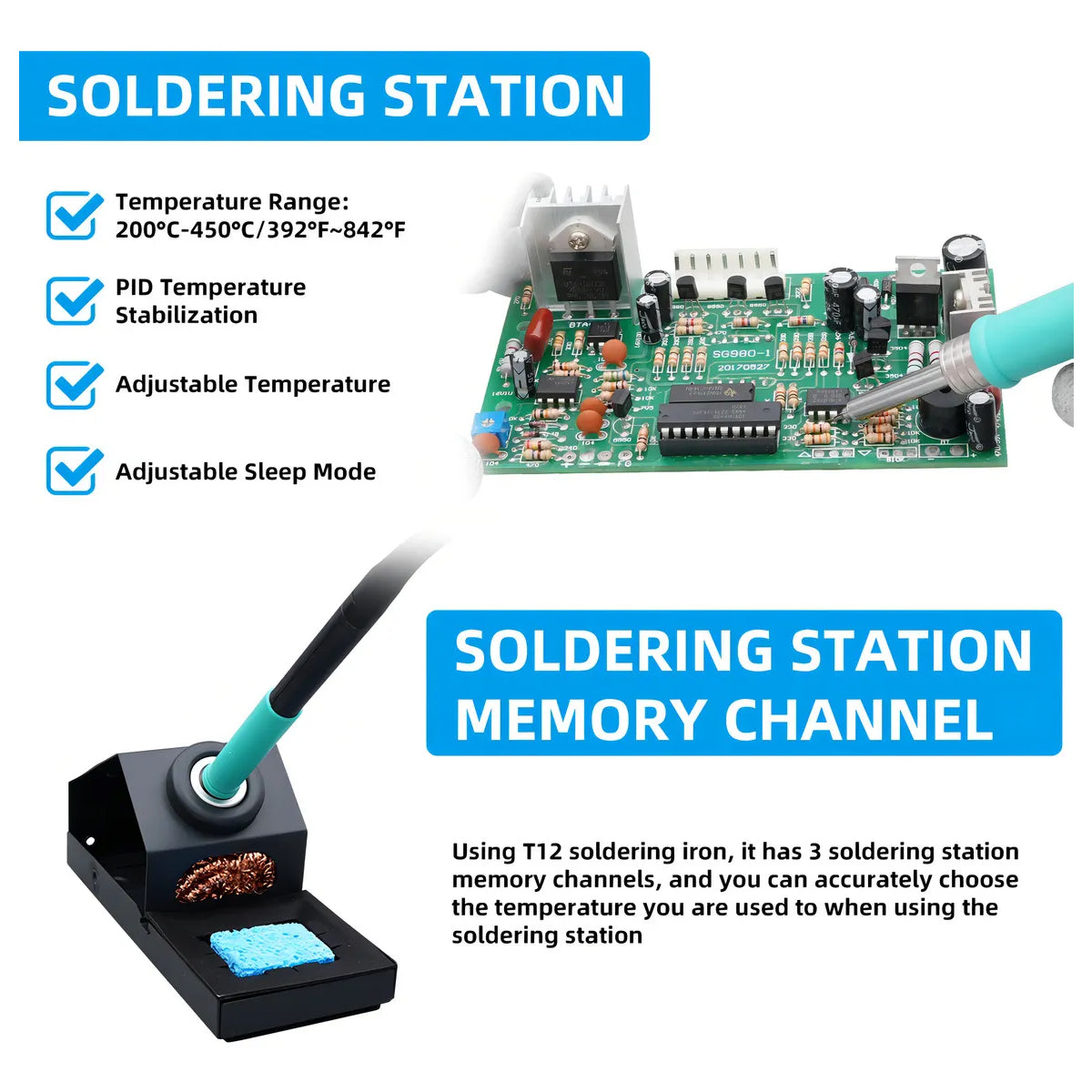 La mayoría de las estaciones de soldadura dos en uno tradicionales del mercado tienen 936 asas. El SUGON-212 utiliza un mango T12, que tiene una mayor eficiencia de calentamiento y una mayor vida útil de la punta del soldador que el mango 936.