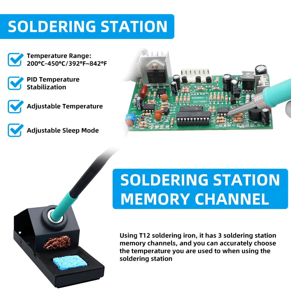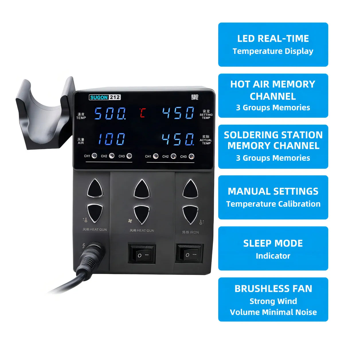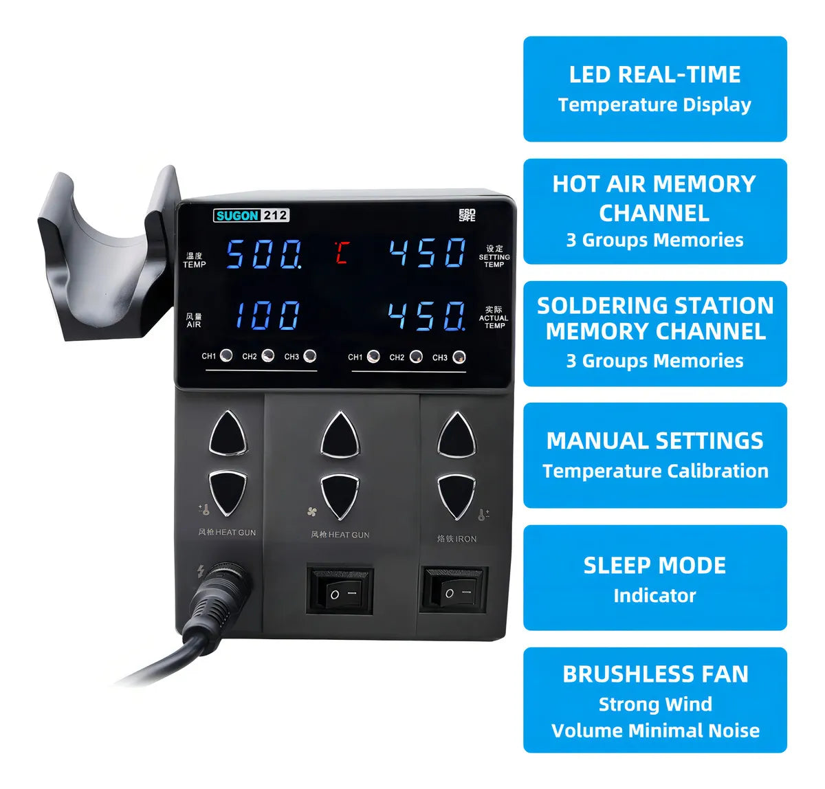 La pistola de aire comprimido y el soldador tienen cada uno tres funciones de ajuste rápido de temperatura (es decir, memoria de temperatura) con un solo clic.