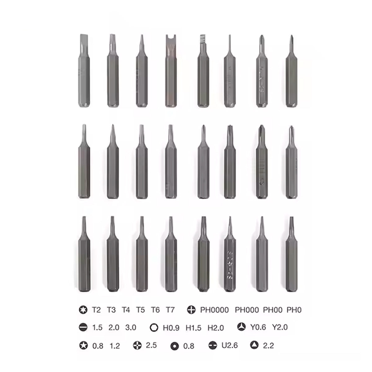 - 33 Puntas magnéticas (Torx, Phillips, Pentalobe, Hex, etc.).