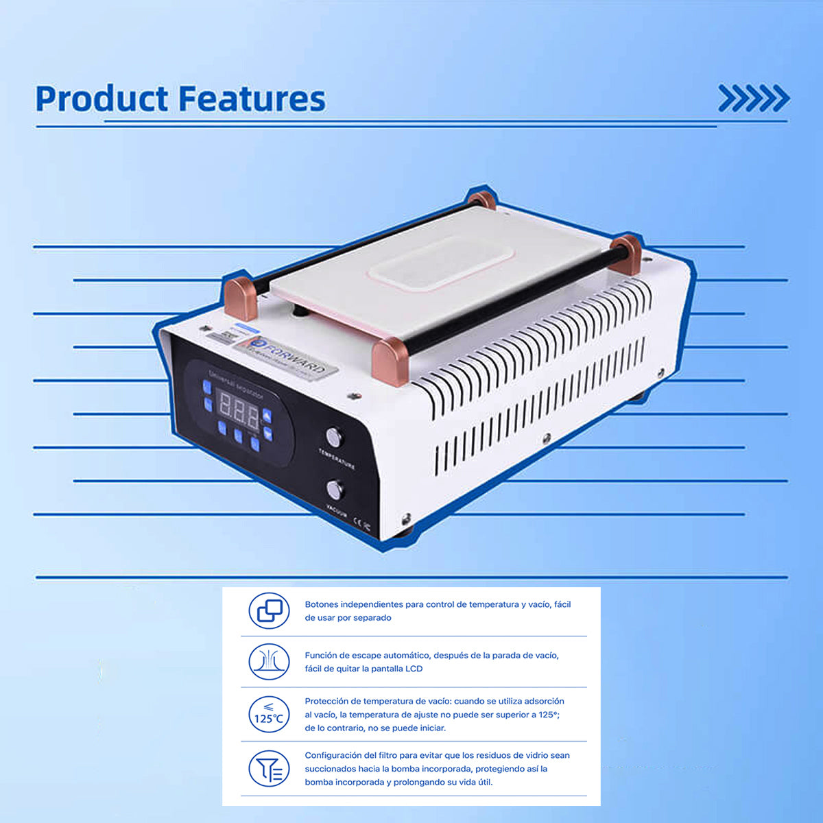 El Forward FW-1082 es el estándar de oro para la separación de cristales y pantallas LCD/OLED de hasta 8 pulgadas. Gracias a su bomba de vacío integrada y su panel de calor de alta fidelidad, permite retirar pantallas dañadas de forma segura, rápida y profesional, siendo compatible con prácticamente cualquier smartphone del mercado.