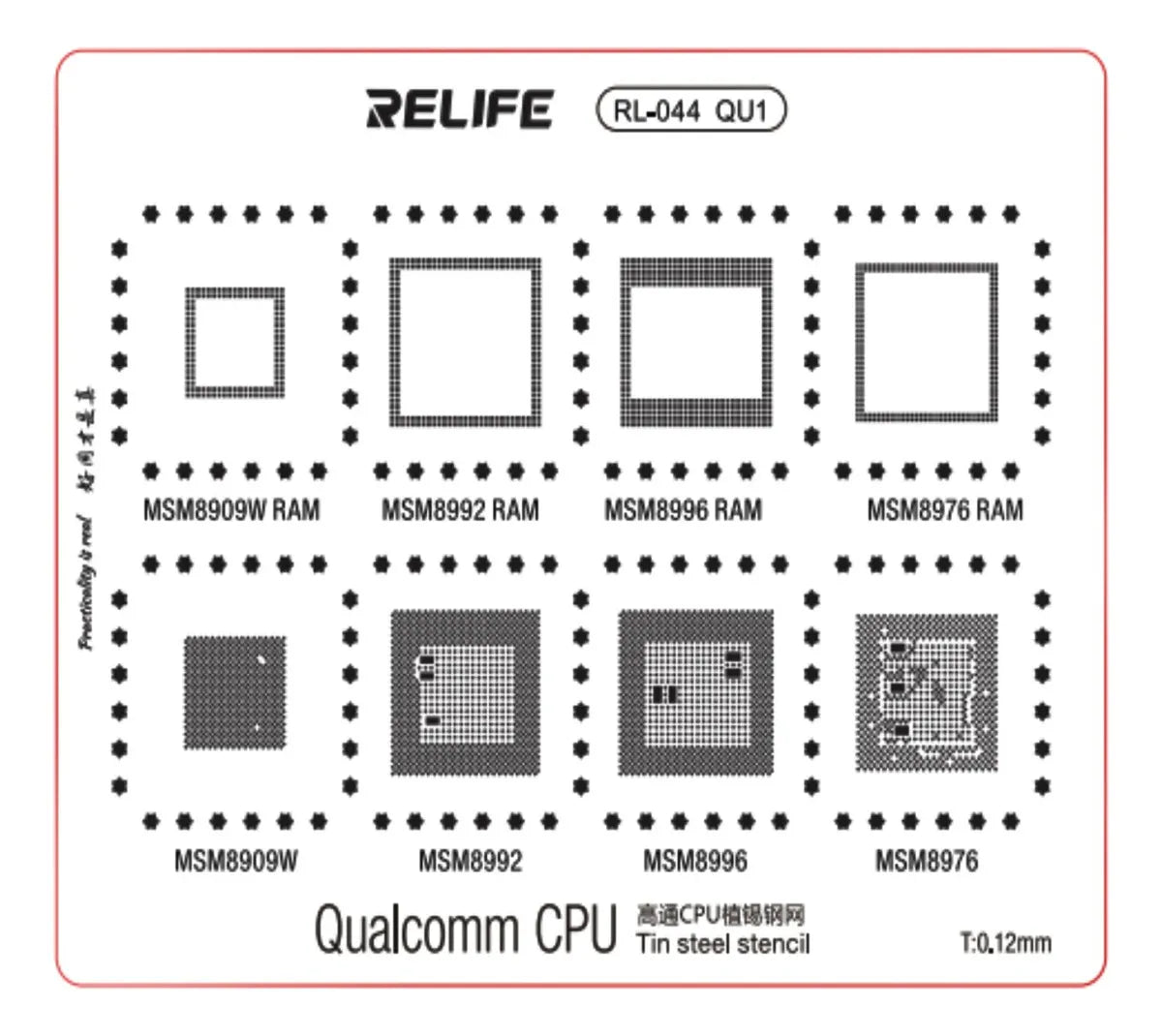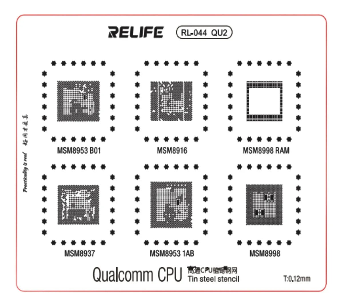 Los stencils RELIFE RL-044 de las series QU1 a QU4 son plantillas de reballing de 0.12 mm de grosor, diseñadas para la reparación de chips CPU y PMIC (Administración de Energía) de la popular plataforma Qualcomm (Snapdragon) en dispositivos móviles.