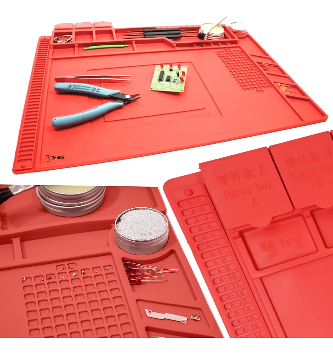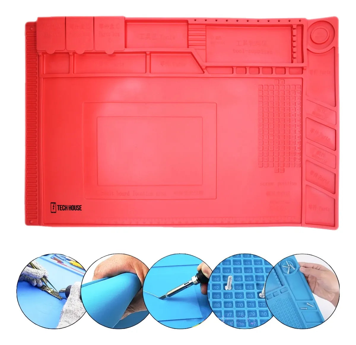 Tapete de silicona para realizar mantenimiento a cualquier tarjeta electrónica, cuenta con aislamiento térmico anti estática, compartimientos para colocar tornillos o piezas de desensamble.